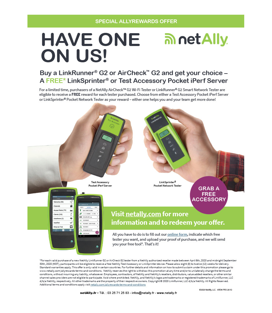 Achetez un testeur AirCheck Wi-Fi G2 ou LinkRunner G2 et recevez gratuitement au choix un accessoire de test de poche iPerf Server ou un testeur de poche LinkSprinter.